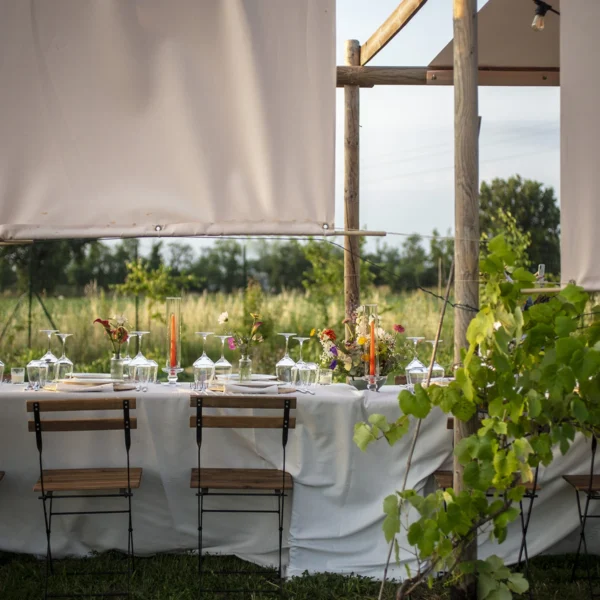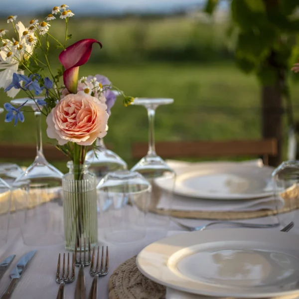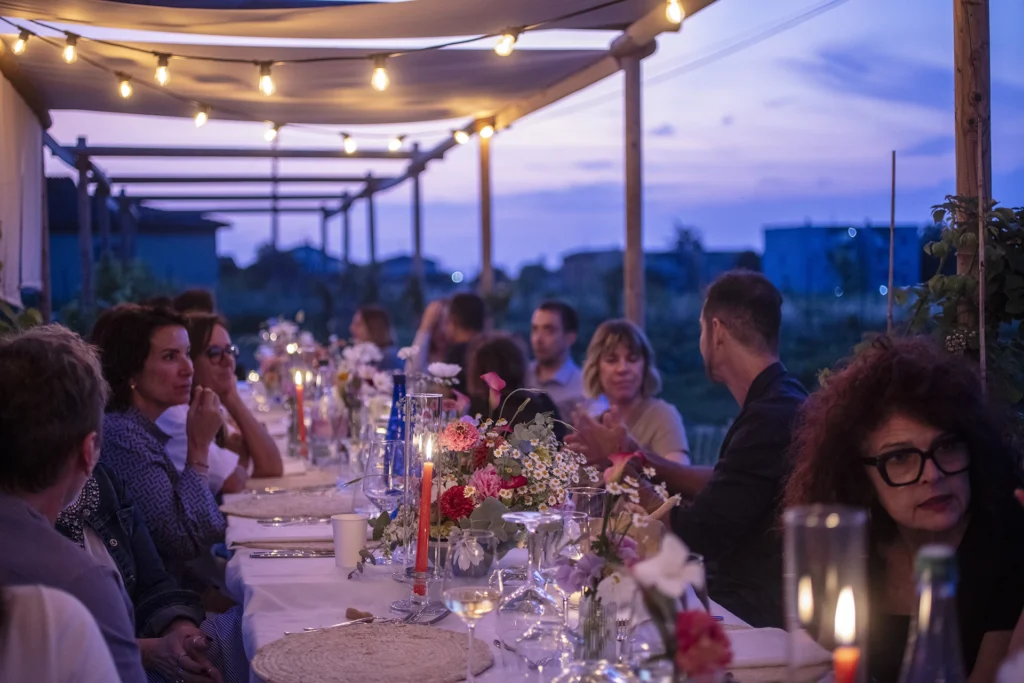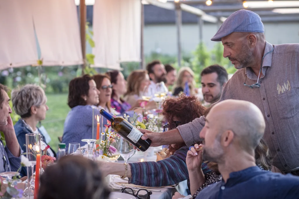 “La cena è fiorita!” è nata così, con l’idea di rallentare, mangiare bene e godersi la bellezza semplice di un tavolo lungo tra i filari, circondato da persone curiose e sorridenti.