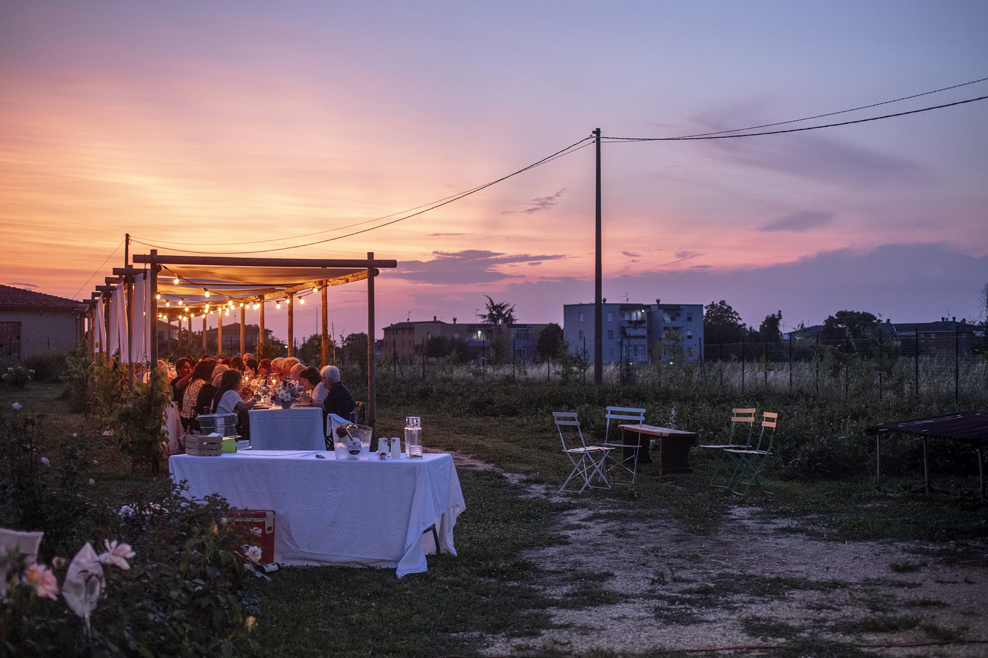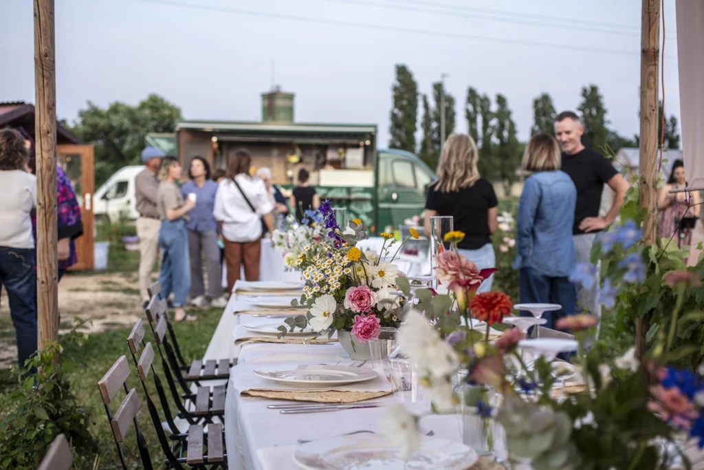 La flower farm si è trasformata in una sala da pranzo a cielo aperto, profumata e un po’ selvaggia – proprio come piace a noi. Il tramonto ha fatto la sua parte, tingendo tutto di rosa e oro (sì, anche i bicchieri di vino).