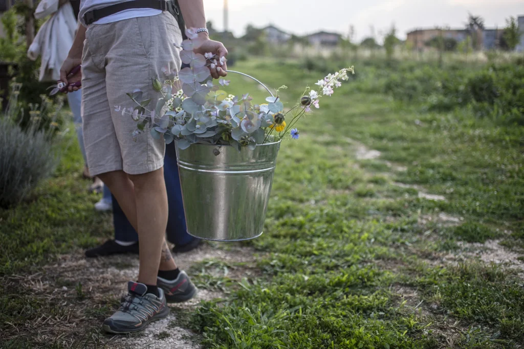 Abbiamo brindato tra petali e risate, mangiato portate ispirate alla stagione e alla terra, ascoltato storie. C’erano fiori ovunque – nei vasi, nei piatti. I centrotavola sono stati realizzati dalle partecipanti al workshop che si era tenuto poco prima del benvenuto agli ospiti e da me, con i fiori rigorosamente raccolti in campo. Stefania di Giusté, che ha ideato il menù, ha non solo decorato ma anche arricchito ogni ricetta con petali, foglie e corolle.