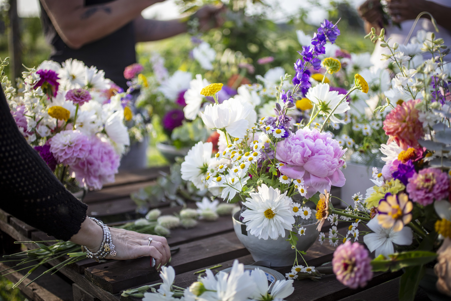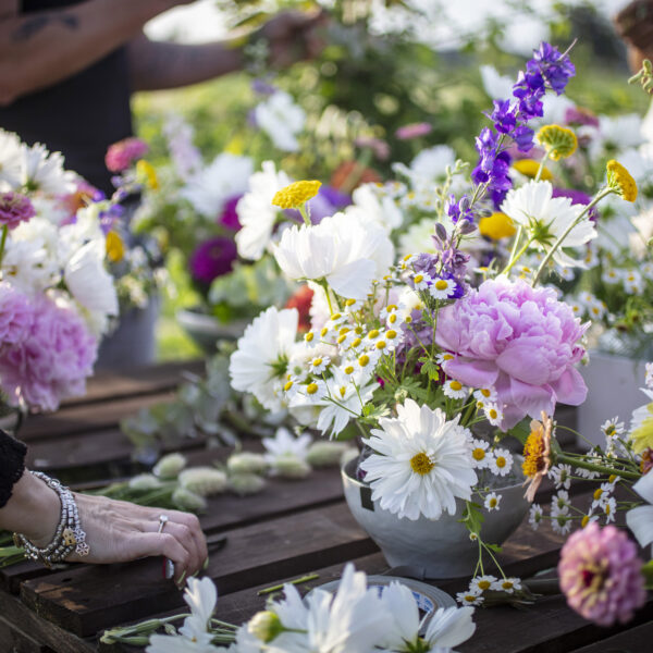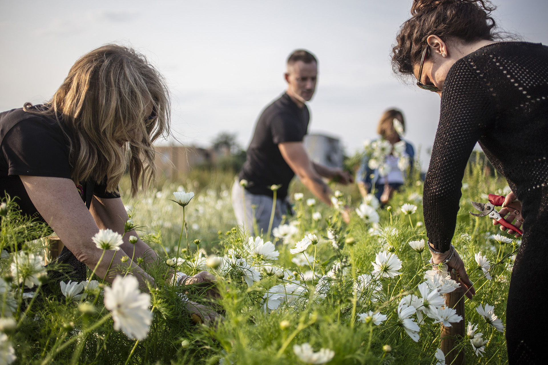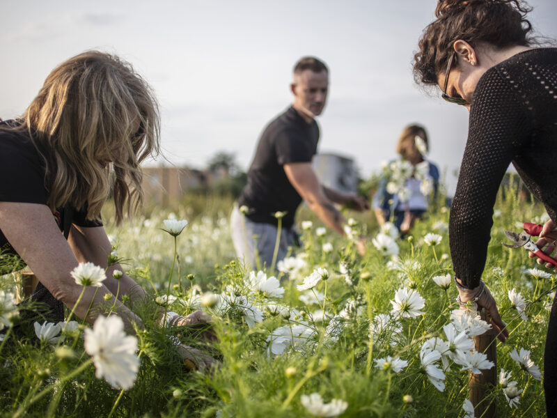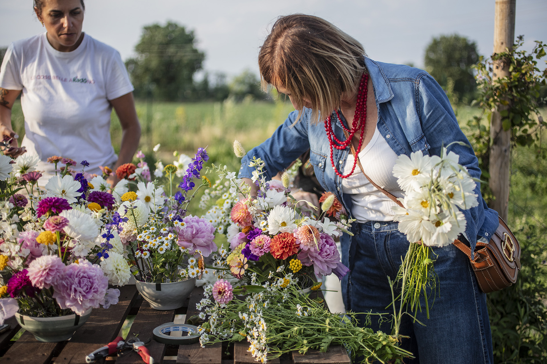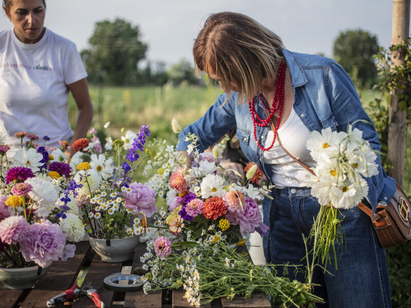 Lungo i filari della nostra flower farm, al tramonto raccoglieremo i fiori direttamente in campo e comporremo poi sul posto un bouquet spontaneo.